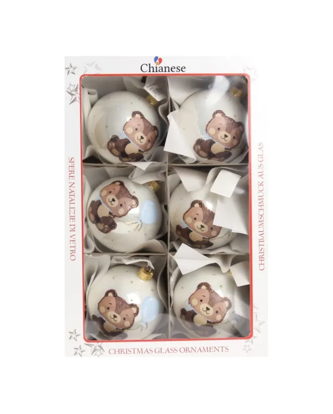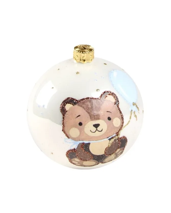 Colore: Biancosfera Di Vetro Decorata A Mano Bianco Lucido Orsetto Con Palloncino Azzurro 80Mm Per Albero Di Natale