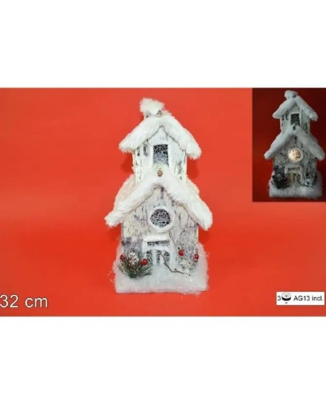 Misure: 32 Cmaddobbo Casa Doppio Tetto Con Luce E Pelliccia Effetto Neve 32 Cm